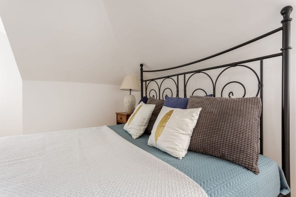 On the opposite end of the spectrum from the fluid feel of fabric is the fixed structure of metal. This certainly doesn’t mean it is without beauty; a metal headboard can have a romantic feel, such as a wrought-iron gate with artificial flowers intertwined.