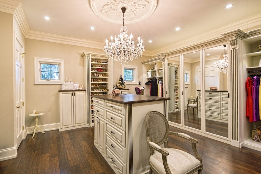 The walk-in closet in this Chicago lake home has antiqued mirror closet doors, in addition to the antiqued door leading into the walk-in. This touch of old-world glamour adds just enough bling to make the room stylish without being gaudy.