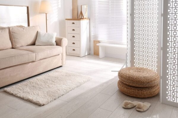Interior of living room, view through decorative room divider