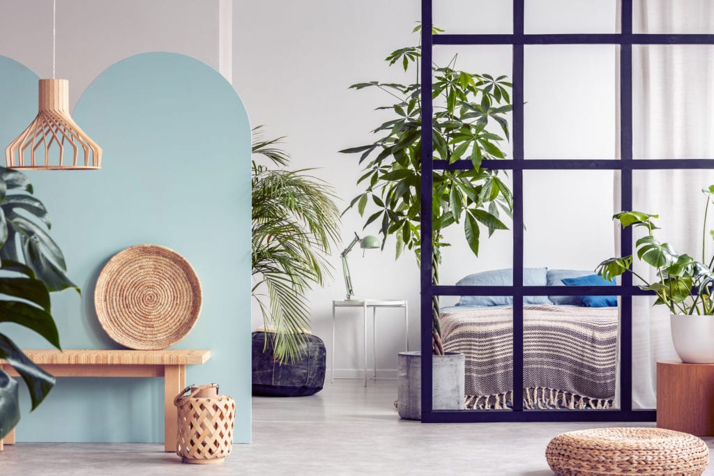 Urban jungle in bright white and blue bedroom interior with partition