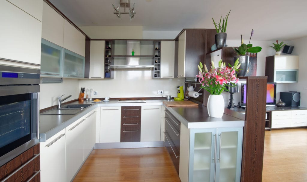 Modern living room interior with kitchen