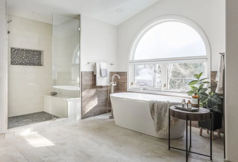 Once you have your color palette in mind, you can add more visual interest to the room by playing around with a variety of shapes, textures, and materials. Think about featuring things like a tastefully curved sink or an eye-catching vanity.
