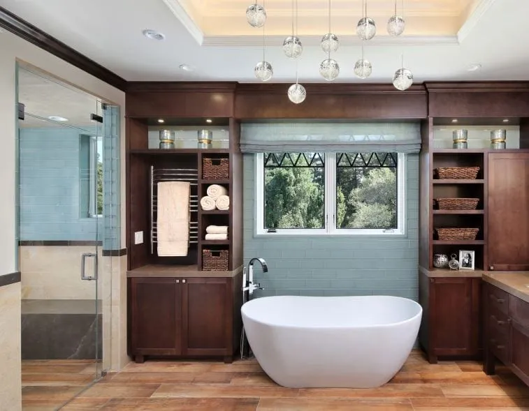 A contemporary bathroom. Image: NKBAShop These Products Now: Chandelier - Bathtub“The uptick in soaking tubs lends itself to a more sculptural feel, giving rise to the contemporary look,” H-Millard says. Features include frameless cabinetry and porcelain tile. “Also, larger surface areas in the bath make it easier to clean, making both transitional and contemporary popular.”