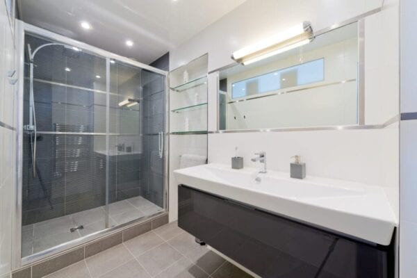 “The wet room, using the linear drain, is an emerging trend in the bathroom,” H-Millard says. If you’re not familiar with this term, in a wet room, there isn’t a shower enclosure. The entire bathroom (or, in other cases, the entire shower and tub area) is considered the shower enclosure. H-Millard notes the two-person, spa-like statement shower is another emerging trend.