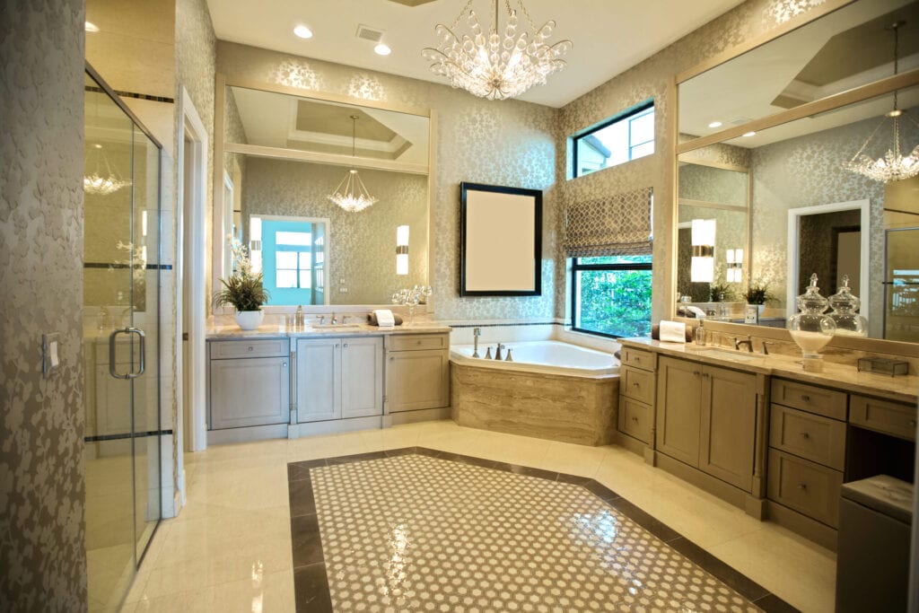 This hand-painted, patterned wallpaper brings out the metal in the console, sconces and faucet. When combined with the chandelier, it creates a glitzy bathroom design. "Wallpaper has really transformed over the last decade," explains Kimberly Schmunk, an interior designer at Focus Builders. "There are several new designers that have a variety of fresh and graphic designs and textures."