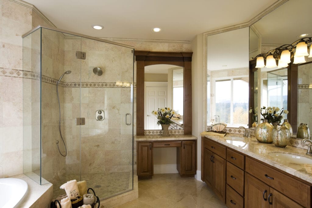 5.) Use a glass enclosure at bathtub/shower area: Shower curtains can be used at your bathroom/shower but will separate your bathroom visually. Opt for a glass enclosure that creates a subtle and visual divider between your main area and your shower/tub. For added privacy many glass enclosures can have a frosted pattern applied to them to give privacy and not get in the way of your illusion of space.