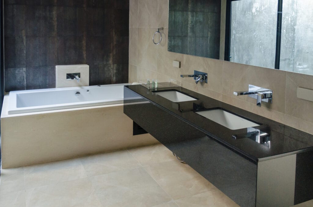 1.) Use a monochromatic color scheme in a small bathroom: Depending on the color you choose and how much natural light illuminates your space, one color can make your bathroom feel larger. Remember one color doesn’t mean you can’t use hues of one color. A bathroom with varying shades of one color will accomplish the same goal. Soft, neutral tones are perfect for this eye fooling trick. If you are able to keep it clean, white will make your bathroom feel the largest!