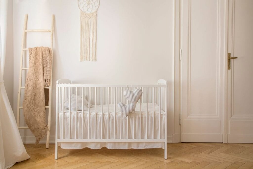 Nursery with neutral colors and heart-shaped pillows hanging from crib Photographee.eu / Shutterstock