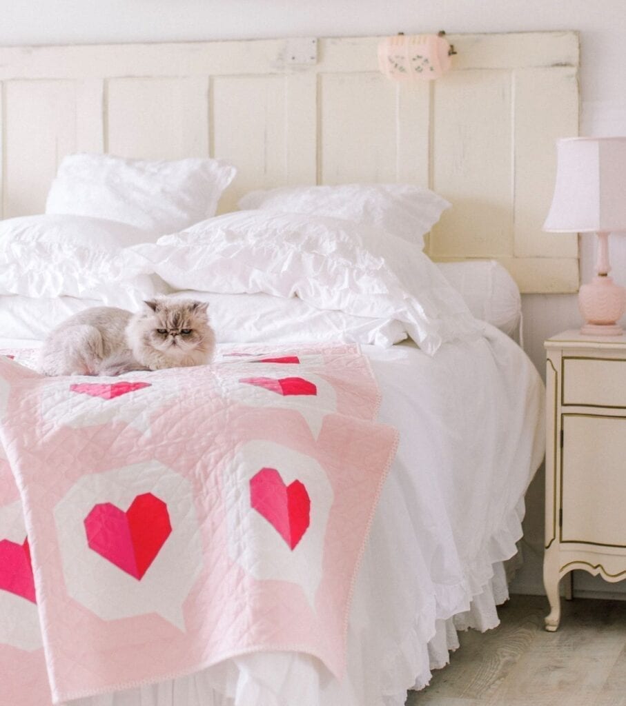 Cat sitting on heart-patterned quilt Tavia / Getty Images