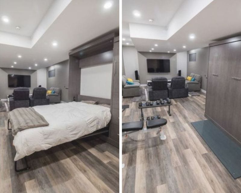 Murphy beds can be used in a variety of applications. “They’re ideal for mixed-use spaces, like an office/bedroom, gym/guest bedroom, theater/guest bedroom, etcetera — and they’re great for occasional use sleeping areas,” explains Paul Foster, President of Contact Renovations & Construction. Foster has also used Murphy beds in some of his designs. In the photo below, he included one in a basement renovation project.