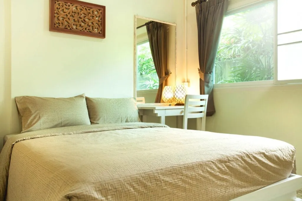 Tone on tone in the bedroom doesn’t stop with just the tone itself, however. Another key aspect of this style is using texture. By using texture, you can keep close to the same shade without making the room look too uniform. For instance, textured walls are a popular choice for getting that visual interest into a space. The texture is highly noticeable as it surrounds the whole space. Textured carpeting or rugs can also have a similar effect. A great attribute of this look is that the texture can be as bold or subtle as you want it to be. The photo above takes a more subtle approach in the texturing on the walls and carpeting. It also shows that tone on tone can veer more into a monochrome style if you choose to stick close to one shade. There can be some overlap between tone on tone and monochrome styles.