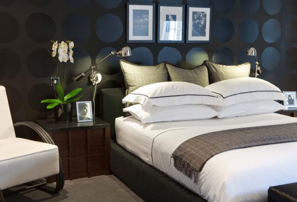 Another option for tone on tone in the bedroom is to focus on different types of paint finish. That way, you can get the different texture in a fun and creative way. For instance, the wall in the photo above went for circles of black high gloss paint over a matte black paint. The funky, fun geometric style that results is the essence of tone on tone: using different textures to play around with one color family. What you get is the illusion of a lighter black against a darker black by using different paint finishes alone.