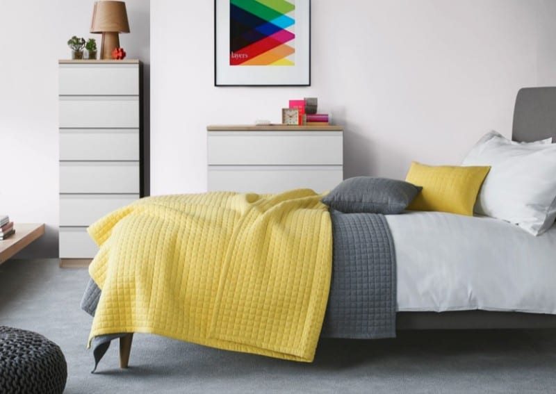 One of the best ways to give your bed a warm and contemporary look for fall is by adding quilted bedding. The quilt pattern adds geometric texture to your bed and can be mixed and matched with other textures and patterns. In fact, as the inspiration images above showed, the more mixing and matching, the better!