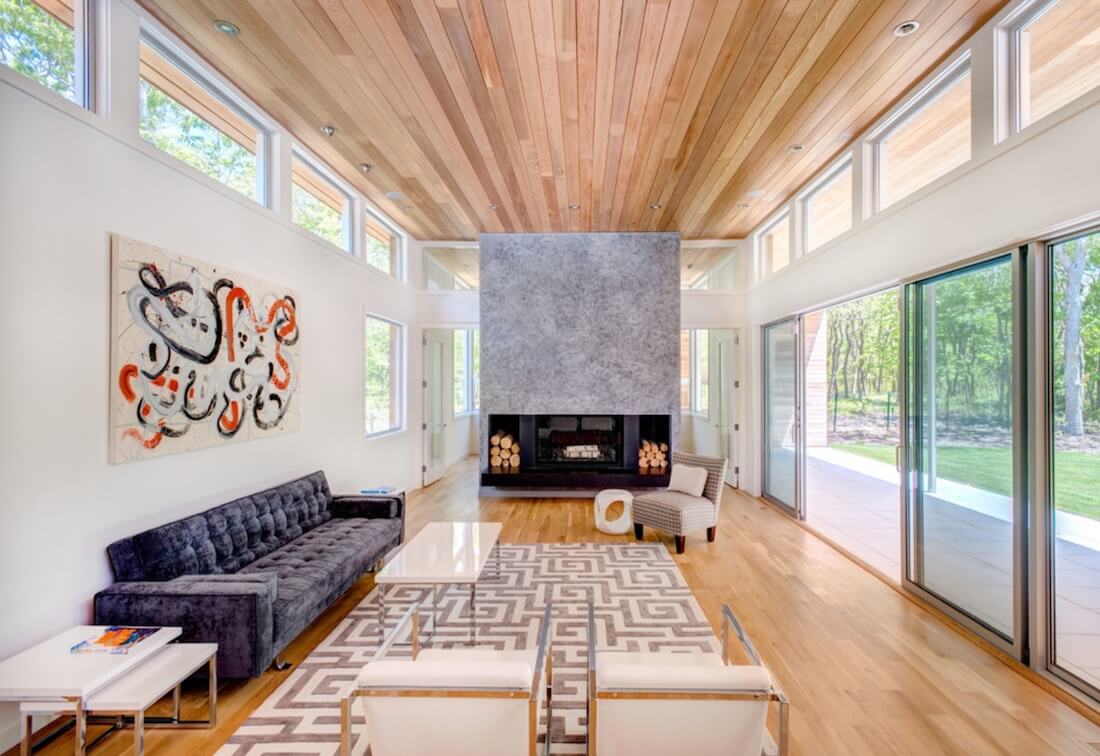 For a fresh take on a modern room, stick to paneling that has lighter colors. Lighter colors, in general, help the space feel more open. The light color of the walls breaks up the wood paneling on the ceiling and floors, and the light gray stone on the fireplace creates an interesting focal point.