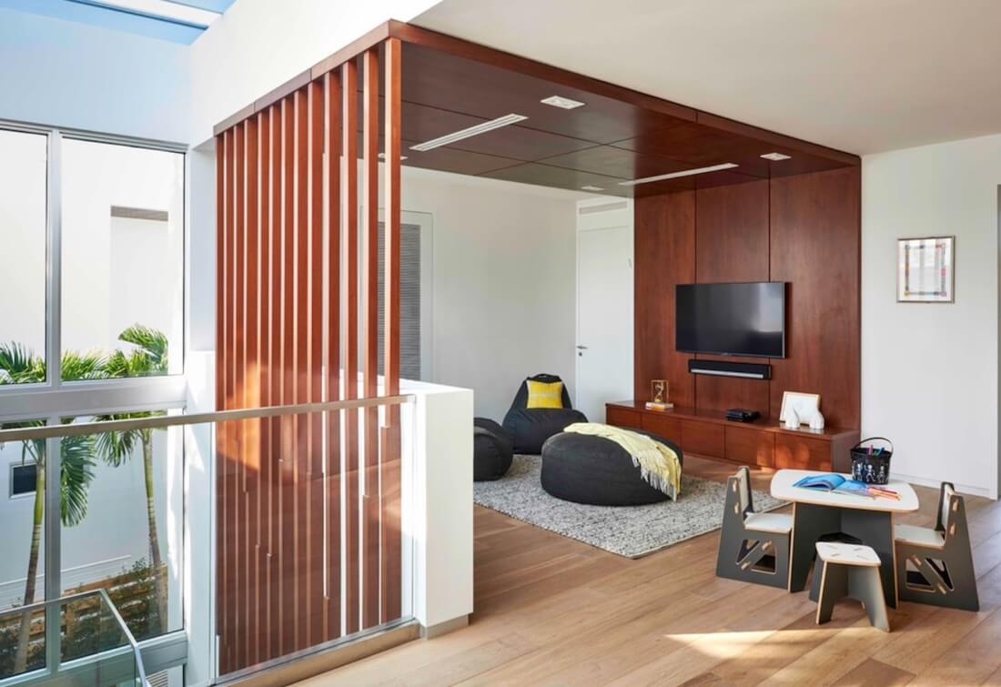 Another way to incorporate modern wood paneling is to use it on just a small portion of the room. In the photo above, a narrow area of paneling surrounded by white walls actually helps the space look more modern. The wood area creates a sudden change in texture, generating visual interest. The wood paneling also acts as a visual barrier for the sitting area by the TV, which is a good way to separate different spaces in the open-concept areas that modern spaces are known for.