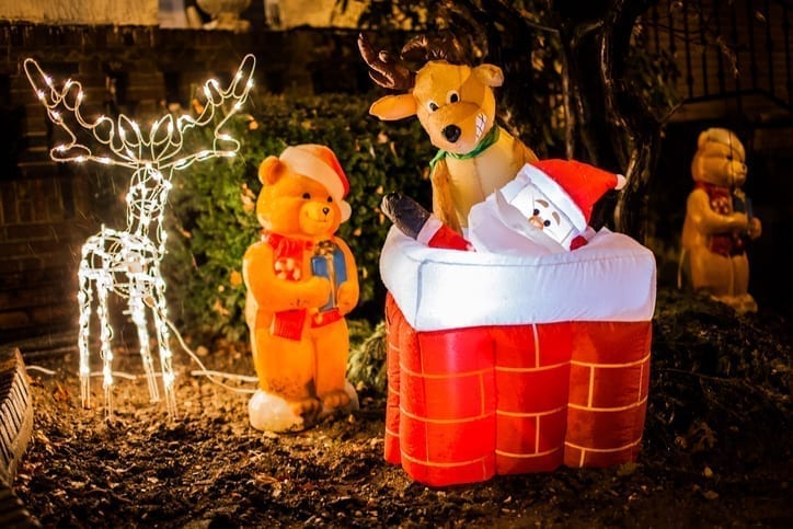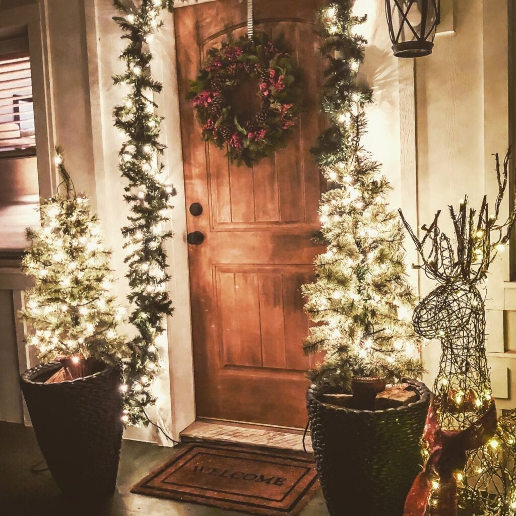 We definitely shouldn’t relegate Christmas trees to the living room space. A brightly lit outdoor tree, be it a cut tree that fits under your porch ceiling, or a live tree in a pot can invite added interest to a decorative front porch display. Decorate the tree with outdoor lights and ornaments and add wrapped faux presents under the tree for a complete display package.