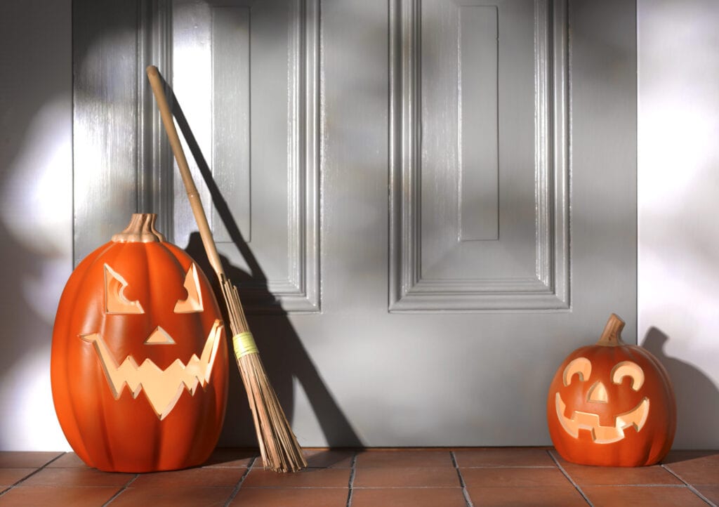 nighttime early evening, lit pumpkins waiting on doorstep for trick and treating time