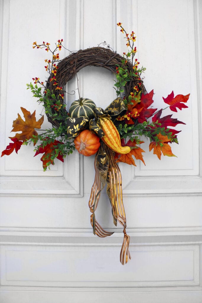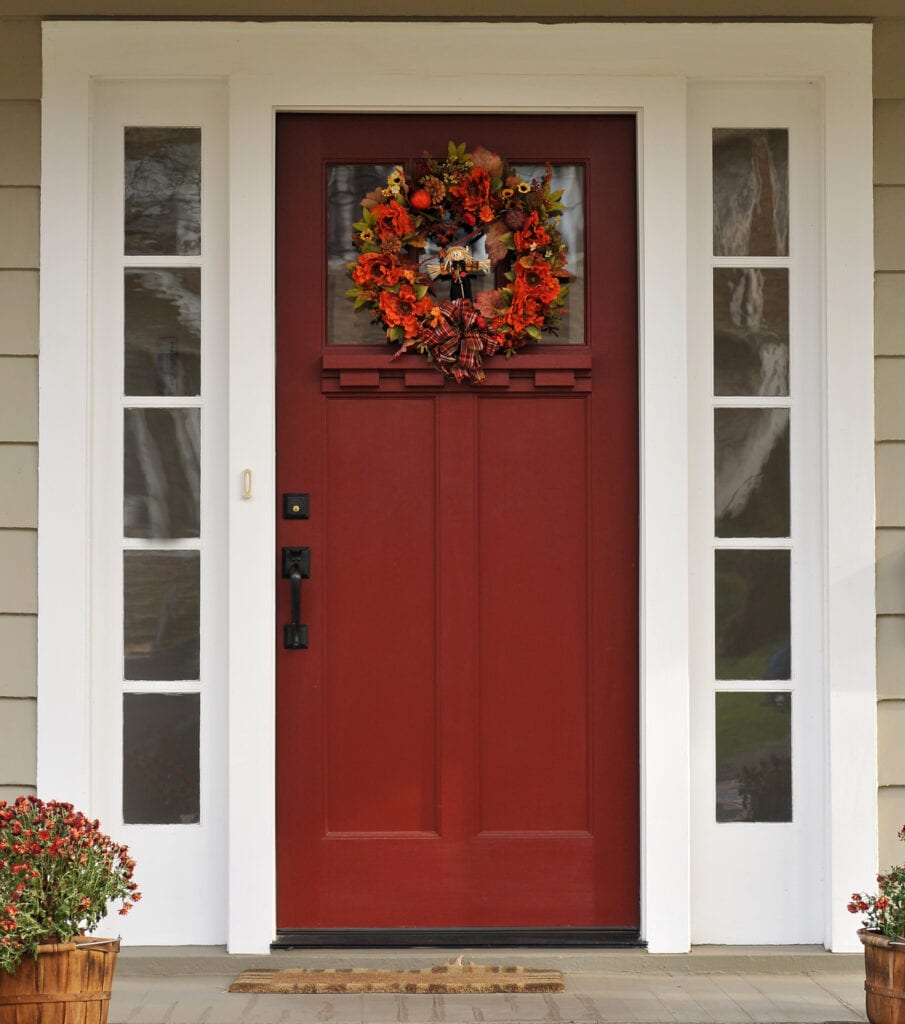 One of the simplest ways to decorate your front porch for fall is to make the front door the focal point. Add a modern wreath and flank the front door with matching oversized planters that can display pumpkin topiaries, tall grasses or a collection of colorful foliage.