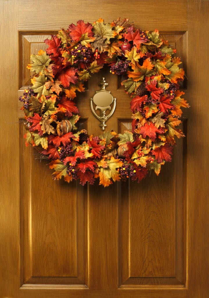 A fall wreath hanging on a door.To see more of my Thanksgiving images click on link below: