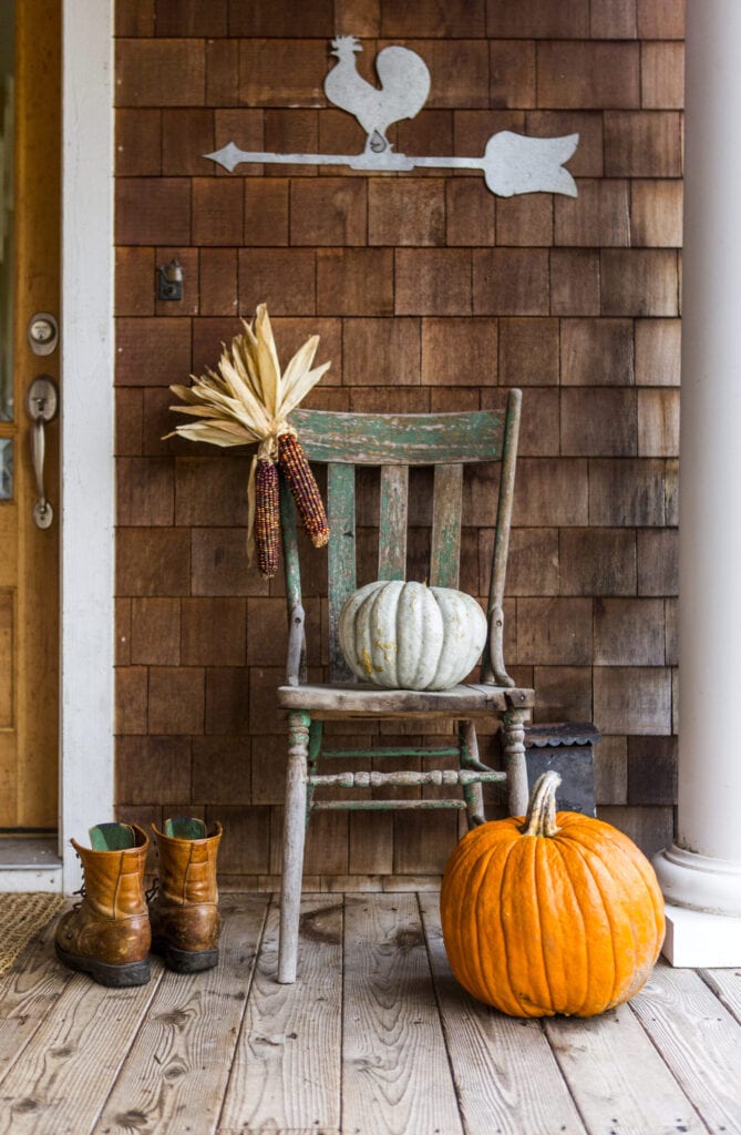 You’ll notice lots of pumpkins in these fall porch decorating ideas. And that’s because they last for months and work long past Halloween. The same goes for mums. These durable, low-maintenance flowers come in many colors — red, orange and white — to work with your pumpkins.