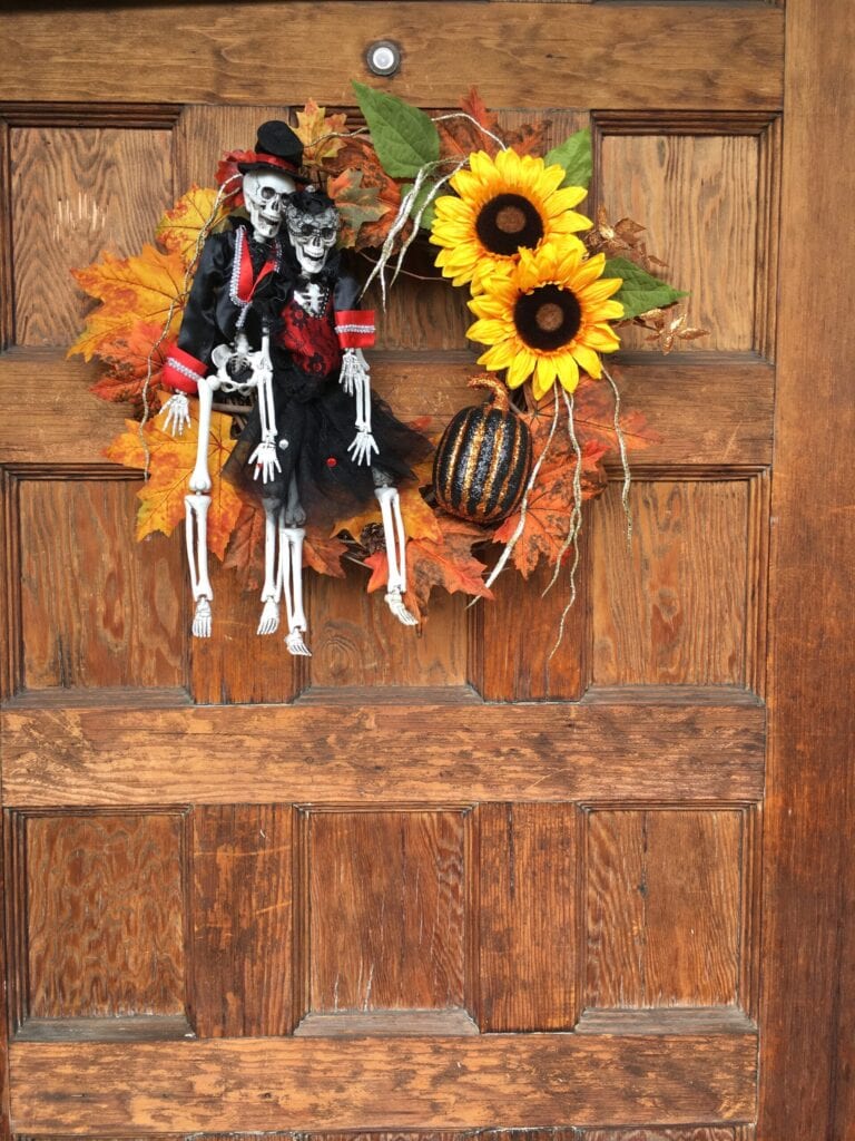 Homemade wreath with Day of the Dead skeletons, fall leaves, sunflowers and pumpkin.