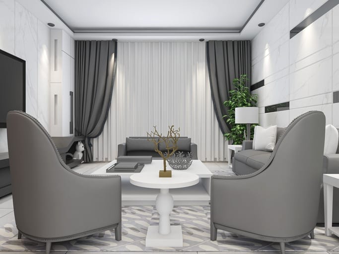 - Asymmetry: Purposefully breaking an established pattern of symmetry in order to draw attention to a particular design element. These are often things like a piece of statement furniture or an expensive work of art.