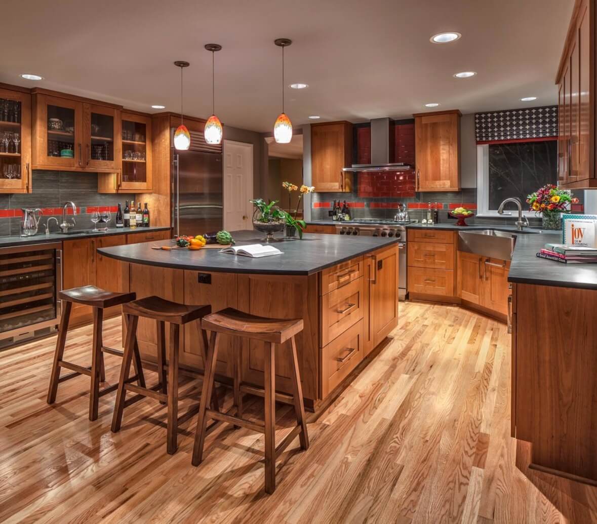 Again, black and white tiles are a favorite for instant contrast that goes with popular light kitchen color schemes. But you can use any color combination you see fit that creates contrast, like dark shades and bold, bright shades. It’s a highly customizable design that you can use to match any color scheme choice.