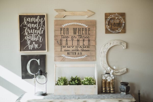 With dozens of other decisions at play, artwork for the kitchen is easily overlooked. Whether you choose an iconic large clock or a sign, your wall art is an easy way to add color to your neutral walls. The secret to using artwork in modern farmhouse decorating is scale. Large wall art gives your kitchen charm and vintage character. Keep your wall art palette simple with two or three colors; busy patterns and bright colors can distract from the simplicity of your design.
