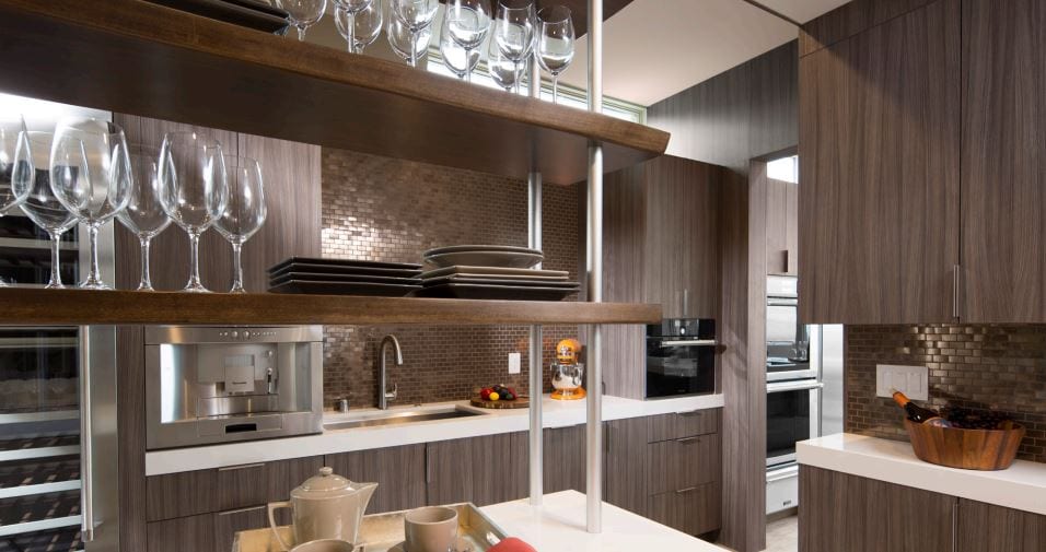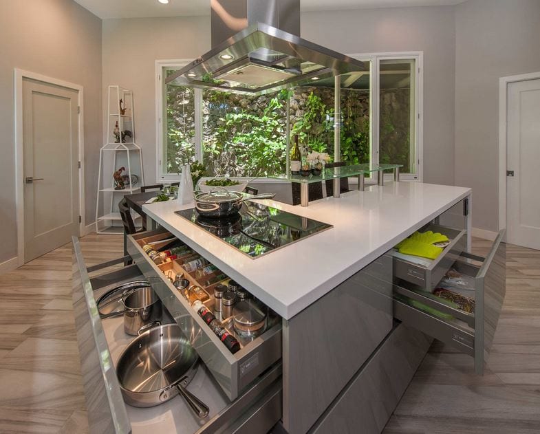 The third most trendy kitchen style is contemporary. “Contemporary lends itself to a minimalistic look,” says H-Millard. “Often, contemporary includes frameless cabinetry with slab front faces and stark, contrasting colors.” She explains that contemporary kitchens have larger surfaces and are more sculptural in shape and appearance. “Your eye absorbs the entire space as one unit.”