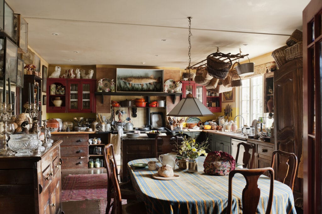 Ask any designer and they will agree that accessories can make or break a design space. Initially, when imagining a farmhouse-style kitchen, one may think of ceramic country roosters pecking on window sills, but this look is becoming outdated.Instead, surprise the eyes with accessories that are anything but country. Look at the kitchen featured below, it is accessorized with ornate, carved mirrors and stone pineapple statues. What a neat design idea!If you want to stick with a rustic style, then consider accessorizing your kitchen with navajo rugs, woolen textiles and twig-style furnishings. Have fun, and don't be scared to play up your kitchen with fun, quirky decor items.