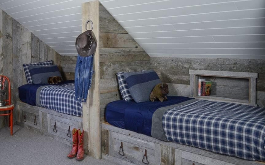 Snyder says there are three single beds along one wall – and one has its own bookshelf, cubby and electric lantern. “There are also two larger beds extending out from the opposite wall,” she says. “The other side of the room is a hangout area with a cozy couch that doubles as an extra bed, a game table and a desk.” Snyder says all of the beds – and many of the walls – were created using locally-sourced barn wood.