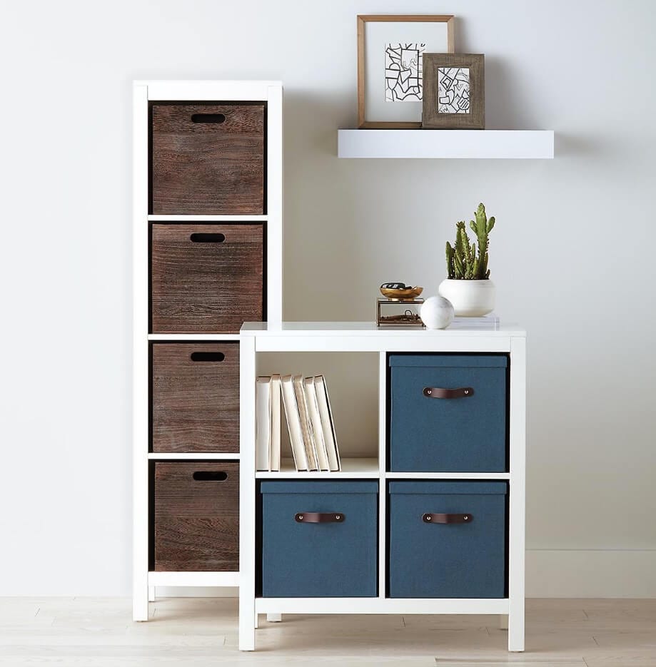 Systems like this are great for fitting into any room style, too. The neutral white of the shelves themselves fits in anywhere, while the boxes themselves can be more customized to fit your room’s style. As you can see, you can also use the box design, or keep the shelves open for things like books or knickknacks.