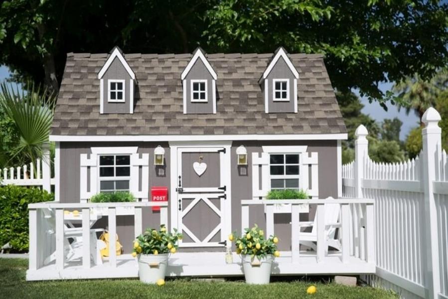 The only thing better than a playroom is a playhouse. house. This one even has a front porch with chairs, a mailbox, a window box, and potted flowers in the yard. The architectural details on the windows and doors make the house look quite realistic. Inside, child-size furniture allows kids to tend to their own home.