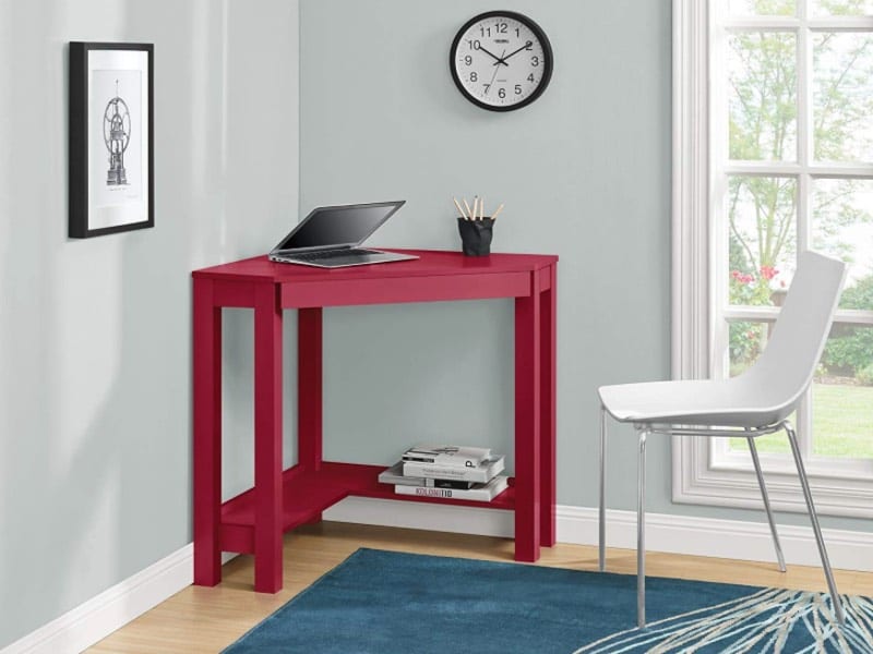 This transitional small corner desk can work in many home styles. Use a cube or square ottoman as a desk chair if your corner area space is limited.