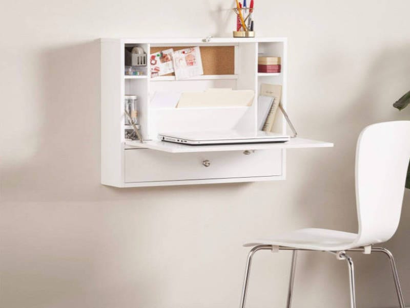 This well-designed wall desk has cubbies and a cork board to keep you organized. The actual desk surface area drops down, with the door becoming the supporting leg. To clear the area when done, put everything back in the cubbies and fold the unit back up to close.