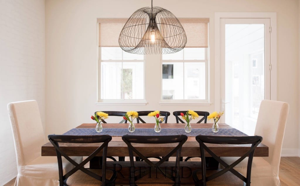 First, consider proportions of the room. You’ll want to account for the size of your table, and the proportions of your room itself. If your formal dining room table seats 10 people, you may want to look into a row of matching pendants. But, if the room only seats your family of four, perhaps a single chandelier will do the trick. As a rule, your light fixture should cover 2/3 of the table.