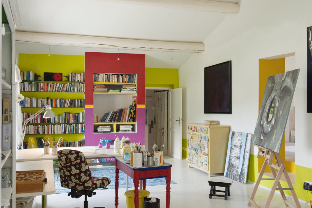 A craft room getaway should be stylish and functional. For the focal point of the room, opt for large, sturdy tables with plenty of work space. Though you’ll probably spend time standing and moving around while you craft, you’ll also want some seating: a task chair that you can move around easily in, especially while you’re at your table, but also a more comfortable chair you can lean back in if you’re working on something like knitting or needlepoint. Plenty of storage allows you to host all your craft supplies out of sight and avoid clutter. But don’t be afraid to have things out on display! You are crafting, after all, and you should show off your work.