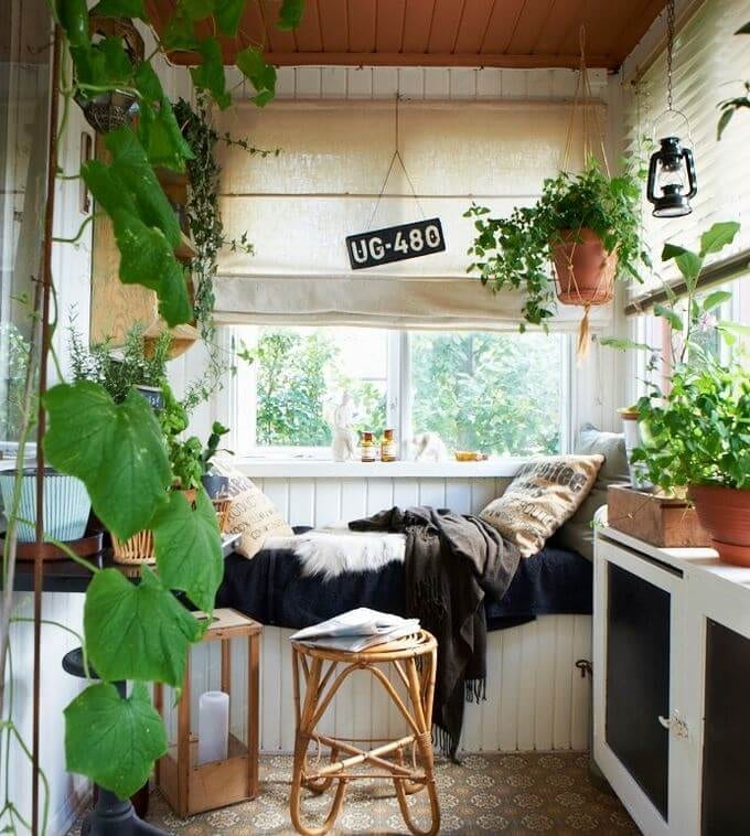 Here’s another idea for a reading nook. Just carve out a space on your front porch. You can use plywood to create a bench seat – and ply-bead panels painted white create architectural detail. Cover the bench with foam and your favorite fabric. Add a few pillows and a comfortable throw to create a cozy area. The plants and natural light help to create a serene retreat.