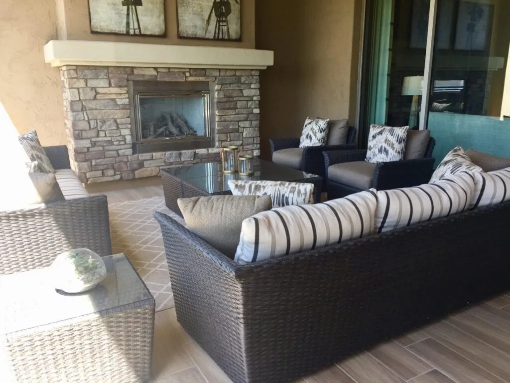 Stone is a natural material for a fireplace. It's fire resistant and can be arranged in attractive patterns. Different colorings also make for interesting contrast. Depending on how the stone is arranged, you can have a rustic look or a more neat style — you might even use the stone to create an accent wall. What's more, stone offers versatility in any outdoor setting. Stone outdoor fireplaces allow for cooking additions like a pizza oven. Some styles add a TV onto the stone’s surface above the fireplace.