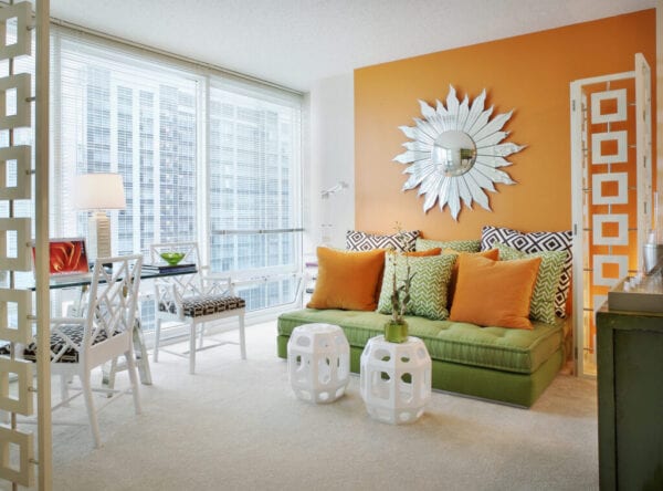 The color orange is typically associated with fun and creativity. “For instance, the vivid Orange Slice evokes a sense of playfulness,” according to Sue Kim, senior color designer at Valspar. This vivid color choice works better in some room than others. “When choosing colors for your home, you want to decide beforehand what the mood and the feel of the room is,” according to Skafidas. “For instance, a child’s playroom or even a kitchen usually has more of a cheery, upbeat feeling and can handle more saturation,” Skafidas says. “Of course, any of these rooms can handle saturated accents and trims when paired with less saturated wall colors.”