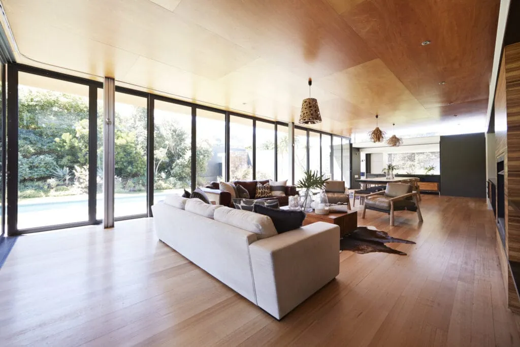 Designed by architect Michael O’Sullivan for his new Auckland home, this snug lounge showcases a herringbone ceiling that acts as a focal point without compromising the space. Rarely seen, this intriguing design found at Dwell reminds us of the potential of each design element in our home.Geometric Balance Creates Elegance
