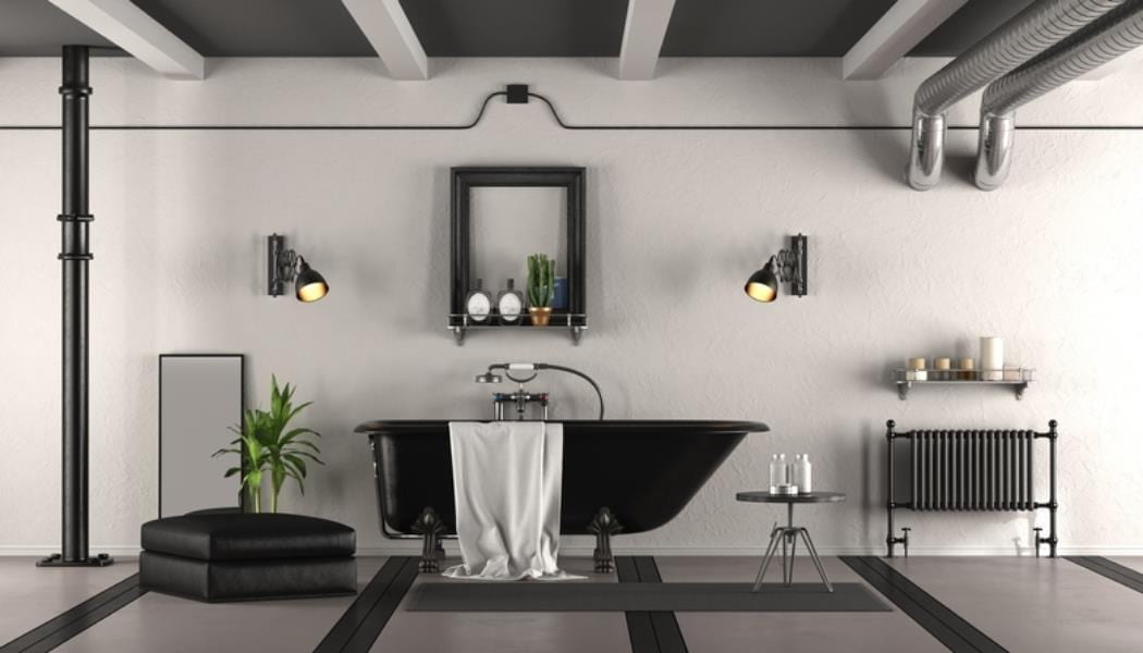 Exposed pipes create an industrial vibe in this bathroom. Image: PlusONE/Shutterstock