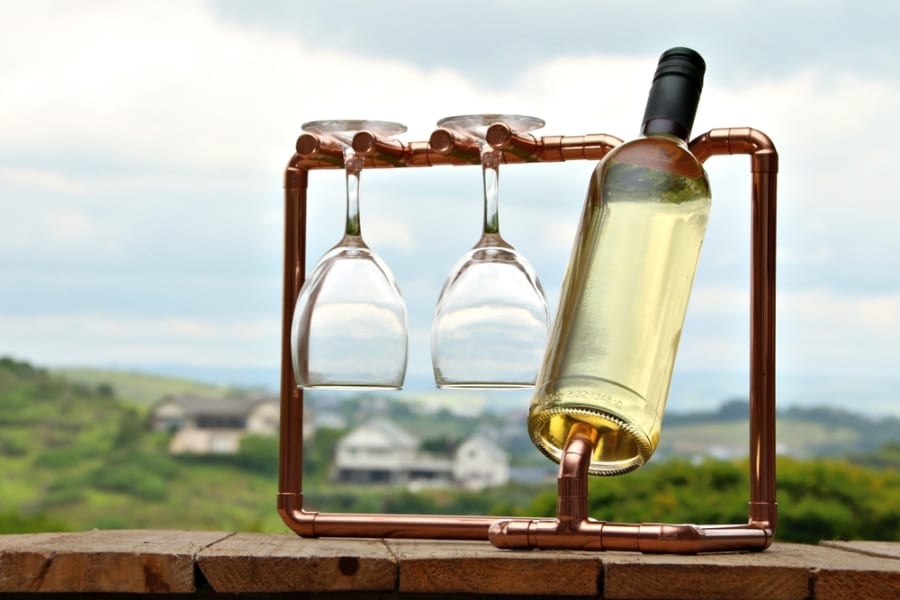 Wine bottle and champagne glass holder made of pipes. Image: Saphotog/Shutterstock