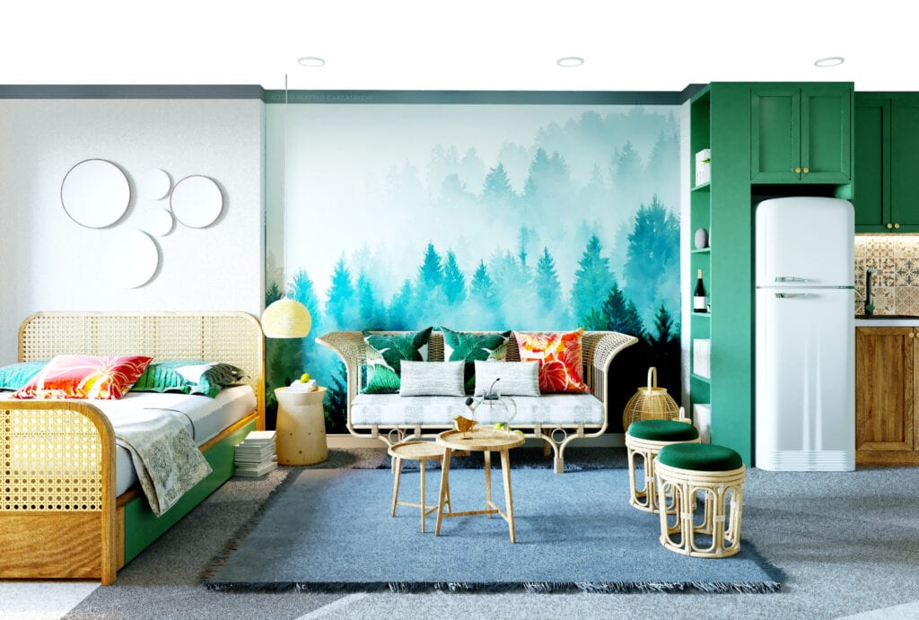 The obvious reason for showcasing one wall in a room is to add a creative element — in other words, to jazz up a boring room. But highlighting a wall also has more subtle and transforming design benefits.Depending on the finish or color you use, a feature wall can seemingly enlarge a small room. For example, painting one wall a darker color surprisingly adds depth and drama to a cozy space. Or adding a mirrored wall detail in a small bathroom makes the room feel larger. Distinguishing a wall also can help define that space for a specific function. One of the most common uses for a feature wall is to carve out a dining area in a living space. Do this by placing the dining table next to the feature wall and coordinate elements, such as accessories for the dining table, with the wall. Using harmonizing elements on a feature wall that exist elsewhere in a room can enhance that specific design element. For example, if your room has ceiling beams made of reclaimed wood, try adding a reclaimed-wood design component to your wall.Similarly, if your space has high ceilings, accentuate this wonderful feature by adding a vertical detail to your showcased wall.Getting creative on one wall also helps detract attention from something you don’t want people to focus on. If your dark view from the window is of a brick wall, create something happy and interesting on another wall for the eye to focus on.Finally, highlighting just one wall is cost efficient and embraces the innermost commitment-phobe; after all, it is only one wall. In most cases, you can easily change or replace that design detail once you tire of it.