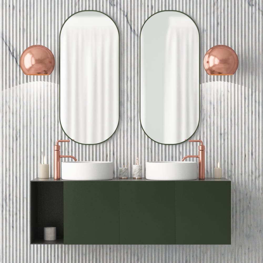 The term “bold” is an understatement for many of the high-contrast color palettes iconic of the Art Deco area and using them in your finishes can bring on the art revival vibe in your home instantly. Bathroom and kitchen tile in monochromatic black, white combinations or with pops of red, and deep browns were gorgeous in this era. To bring the look to your home choose ceramic or porcelain tile that has a high gloss in contrasting colors. Beautiful mirrors and mirrored finishes will complete the look!