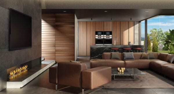 Another way to incorporate modern wood paneling is to use it on just a small portion of the room. In the photo above, a narrow area of paneling surrounded by white walls actually helps the space look more modern. The wood area creates a sudden change in texture, generating visual interest. The wood paneling also acts as a visual barrier for the sitting area by the TV, which is a good way to separate different spaces in the open-concept areas that modern spaces are known for.