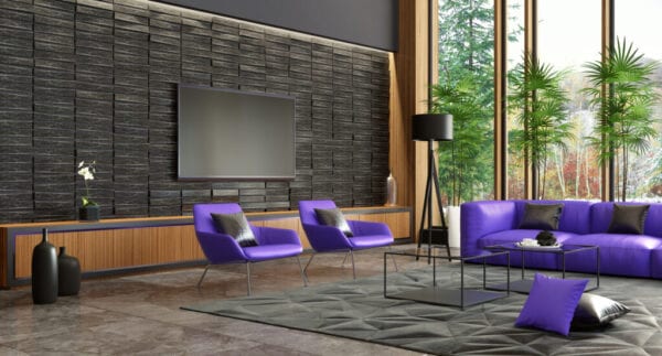 Big luxury villa interior with modern Ultra violet color 2018 furniture. Living room concept with TV.