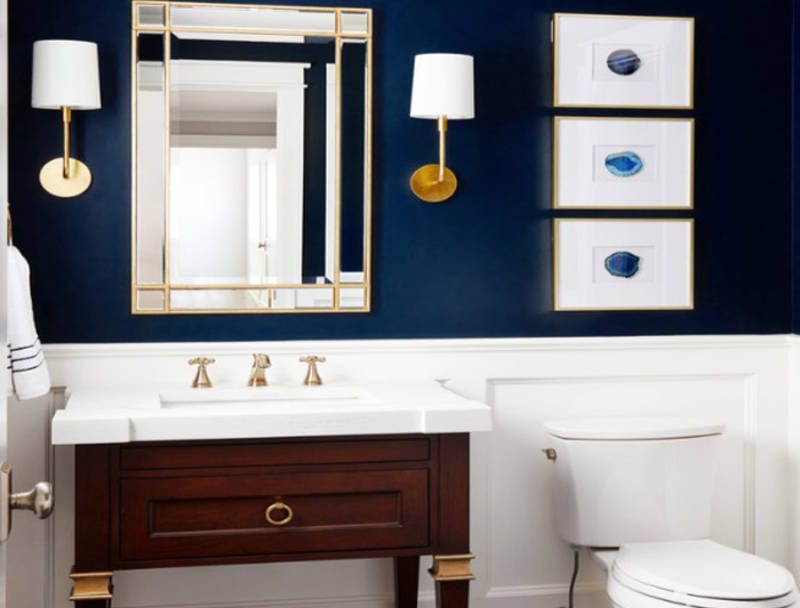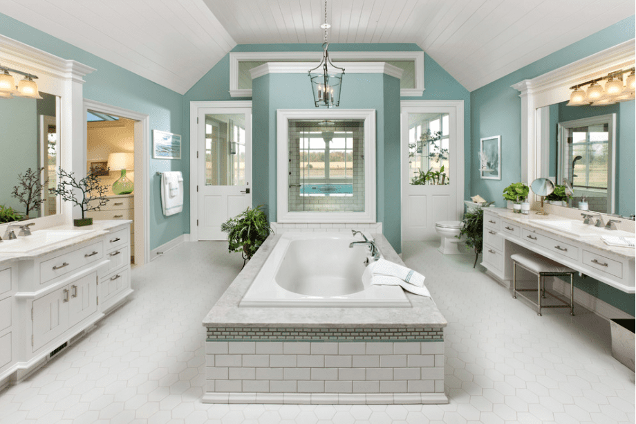 Bathrooms get dirty and dingy quite quickly. Begin a bathroom overhaul with a thorough cleaning. Yes, not a lot of fun, but the shiny result will give you new motivation to spruce-up the rest of the bathroom.Once the room is clean, look to the outdated knobs, light fixtures, vanity, faucets, and shower curtains. By simply changing out one or two of the most outdated items, you can make your bathroom look modern and new. A coat of paint can really go far in a bathroom, as well.Look to the bathroom below and notice all the shiny white painted trim and blue walls; the modern cabinet pulls; the cool lantern light fixture; the modern faucet; the plush towels, and  the pretty plants—-these all add up to a brand-new bathroom, without  tearing out cabinets, walls or sinks.