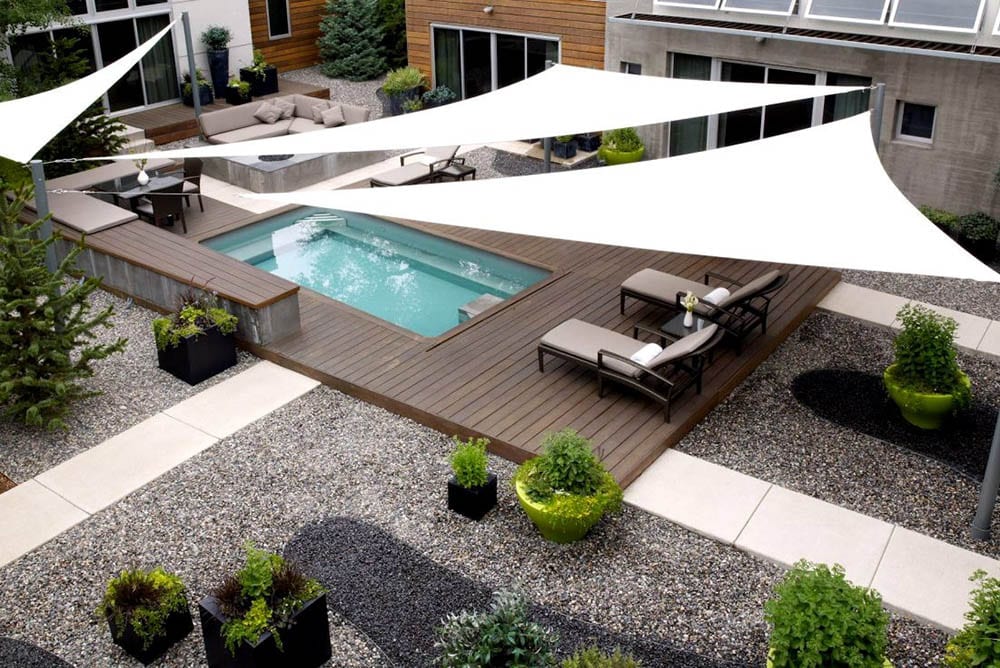Don’t feel limited to a simple patio umbrella. There are so many more stylish shade options: buying (or building) a pergola for a sitting or dining area, raising a Sun Sail for a more modern look, or hanging a large umbrella from your tree’s canopy.