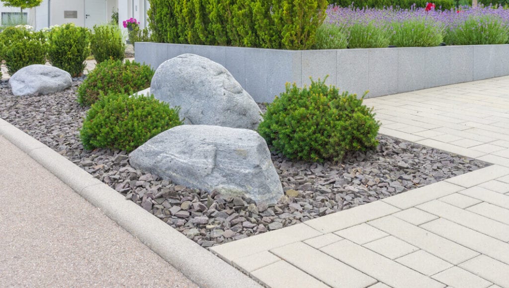 • Stone/Hardscape: The ultimate in low-maintenance, decorative stone works well next to walkways and among other drought-resistant plants. You could use loose colored stones, stepping stones or gravel. You might also look into designs that create more patio space with minimal accents of plant life.